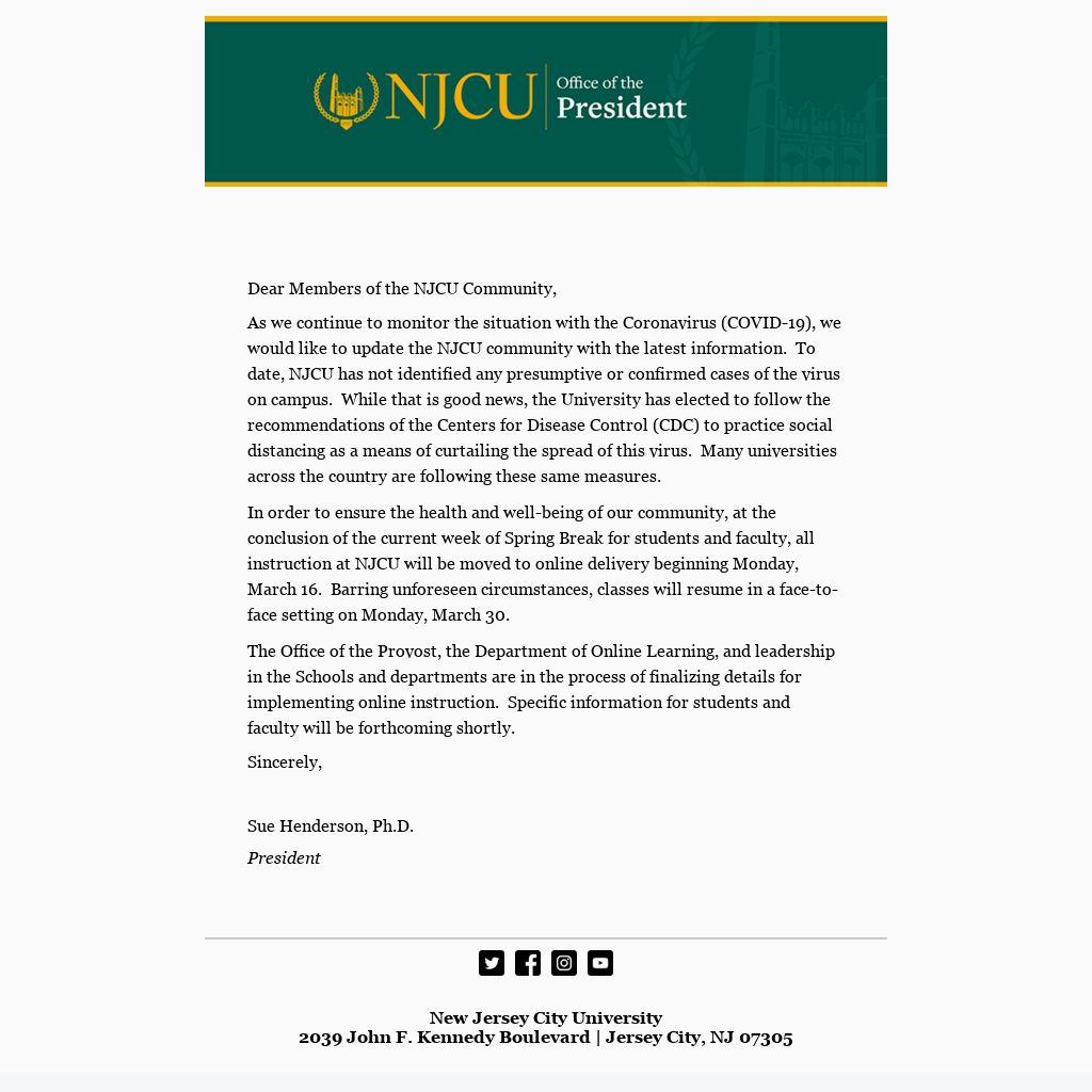 In order to ensure the health and well-being of our community, at the conclusion of the current week of Spring Break for students and faculty, all instruction at NJCU will be moved to online delivery beginning Monday, March 16. Barring unforeseen circumstances, classes will resume in a face-to-face setting on Monday, March 30.