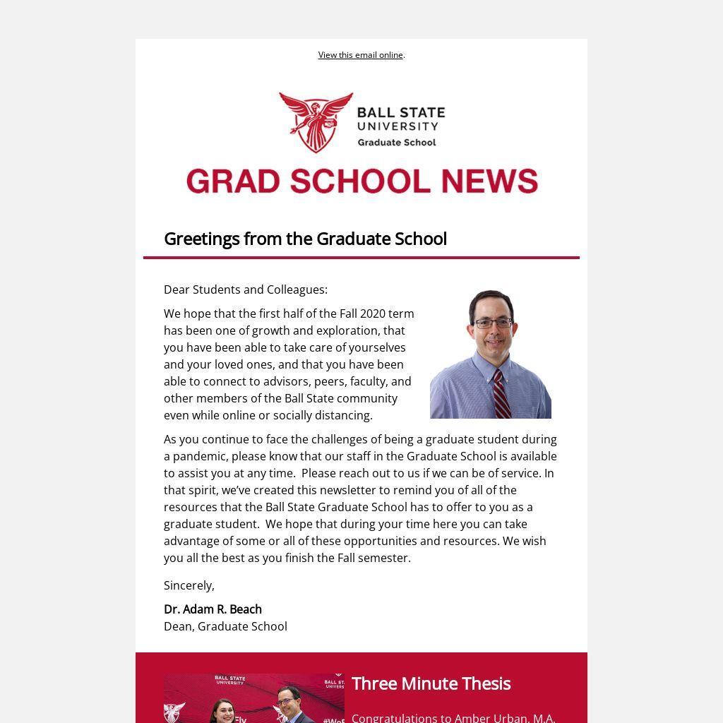 As you continue to face the challenges of being a graduate student during a pandemic, please know that our staff in the Graduate School is available to assist you at any time. Please reach out to us if we can be of service. In that spirit, we’ve created this newsletter to remind you of all of the resources that the Ball State Graduate School has to offer to you as a graduate student. We hope that during your time here you can take advantage of some or all of these opportunities and resources. We wish you all the best as you finish the Fall semester.