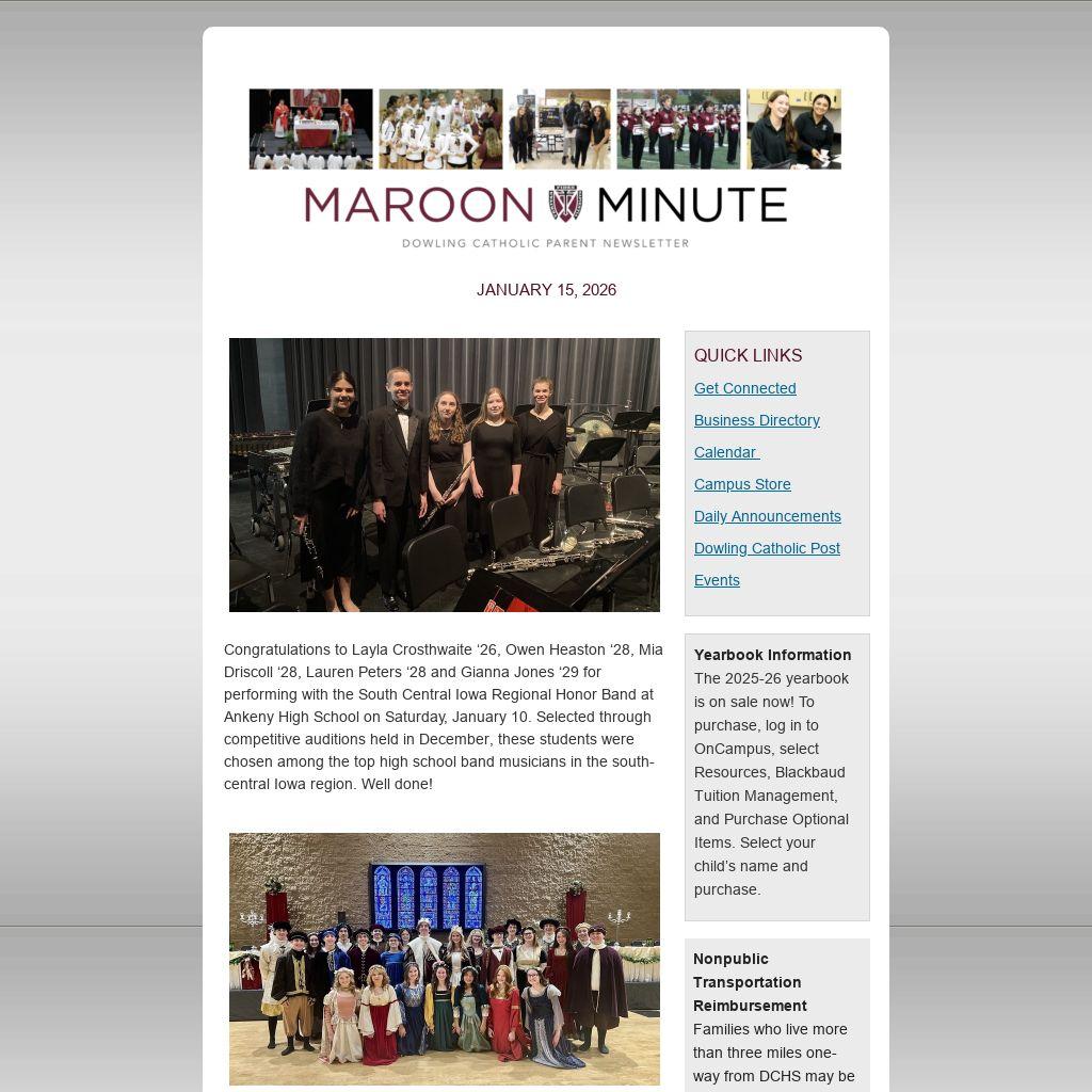 | The Maroon Fund We invite all families to support the Maroon Fund, Dowling Catholic's Annual Appeal, to help us prepare Leaders for Life, Centered on Christ. Your gift strengthens every aspect of the student experience by supporting three essential pillars: Academic Excellence, Student & Faith Life, and School Services. To learn more or make a gift, please visit our website. Checks may be mailed to DCHS, 1400 Buffalo Road, West Des Moines, IA 50265. Thank you for your support!
