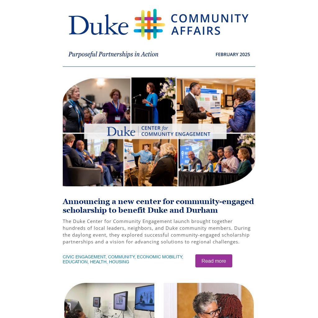 The Duke Community Affairs newsletter is for and about the common interests and projects of Duke faculty, staff, and students and the communities in which they live, work and play. We welcome your comments and suggestions at communityaffairs@duke.edu.