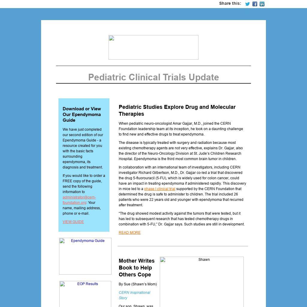 phase I clinical trial supported by the CERN Foundation that determined the drug is safe to administer to children. The trial included 26 patients who were 22 years old and younger with ependymoma that recurred after treatment.