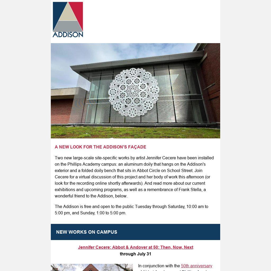 Two new large-scale site-specific works by artist Jennifer Cecere have been installed on the Phillips Academy campus: an aluminum doily that hangs on the Addison's exterior and a folded doily bench that sits in Abbot Circle on School Street. Join Cecere for a virtual discussion of this project and her body of work this afternoon (or look for the recording online shortly afterwards). And read more about our current exhibitions and upcoming programs, as well as a remembrance of Frank Stella, a wonderful friend to the Addison, below.
