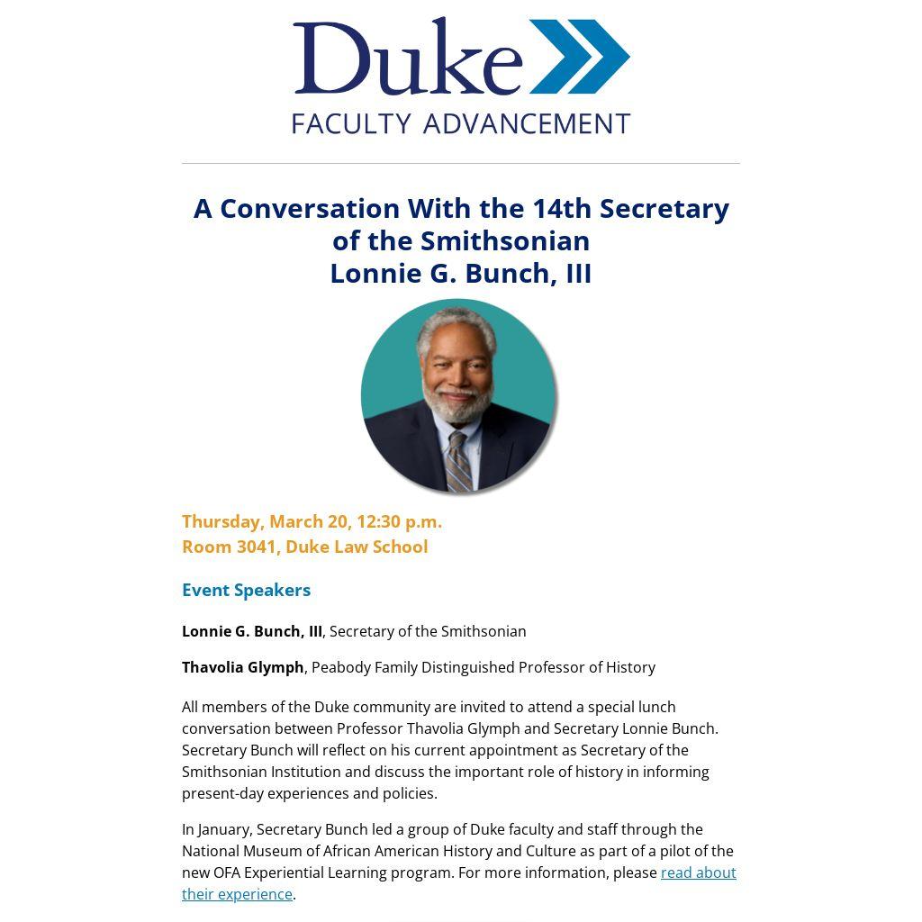 All members of the Duke community are invited to attend a special lunch conversation between Professor Thavolia Glymph and Secretary Lonnie Bunch. Secretary Bunch will reflect on his current appointment as Secretary of the Smithsonian Institution and discuss the important role of history in informing present-day experiences and policies.