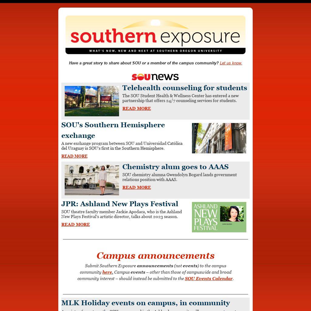 Submit Southern Exposure announcements (not events) to the campus community here. Campus events – other than those of campuswide and broad community interest – should instead be submitted to the SOU Events Calendar.