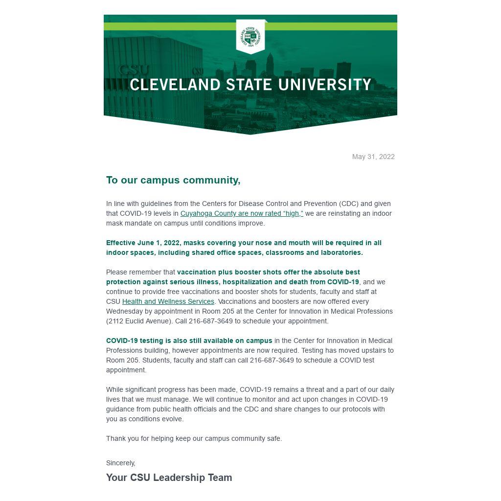Cuyahoga County are now rated “high,” we are reinstating an indoor mask mandate on campus until conditions improve.