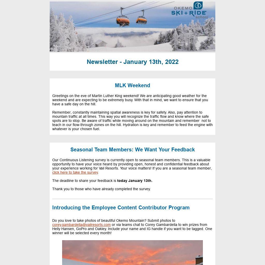 Greetings on the eve of Martin Luther King weekend! We are anticipating good weather for the weekend and are expecting to be extremely busy. With that in mind, we want to ensure that you have a safe day on the hill.