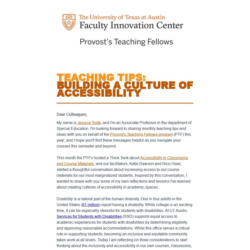 My name is Jessica Toste, and I'm an Associate Professor in the department of Special Education. I'm looking forward to sharing monthly teaching tips and ideas with you on behalf of the Provost's Teaching Fellows program (PTF) this year, and I hope you'll find these messages helpful as you navigate your courses this semester and beyond.