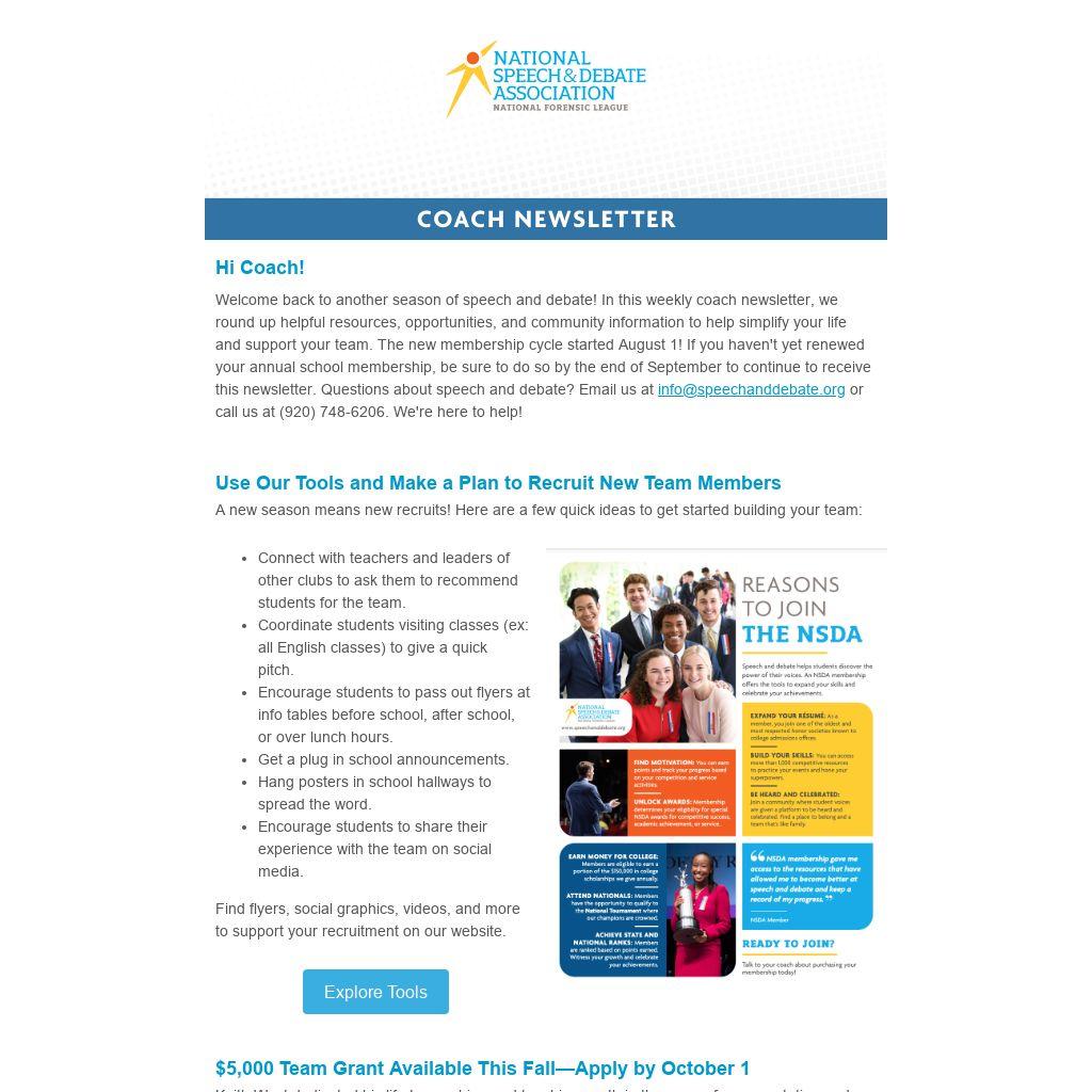 Welcome back to another season of speech and debate! In this weekly coach newsletter, we round up helpful resources, opportunities, and community information to help simplify your life and support your team. The new membership cycle started August 1! If you haven't yet renewed your annual school membership, be sure to do so by the end of September to continue to receive this newsletter. Questions about speech and debate? Email us at info@speechanddebate.org or call us at (920) 748-6206. We're here to help!