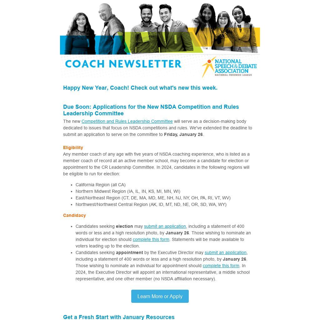 The new Competition and Rules Leadership Committee will serve as a decision-making body dedicated to issues that focus on NSDA competitions and rules. We've extended the deadline to submit an application to serve on the committee to Friday, January 26.