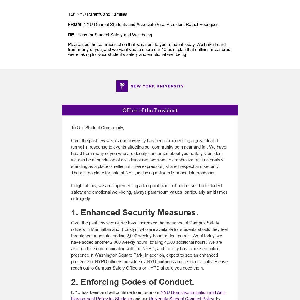 Over the past few weeks, we have increased the presence of Campus Safety officers in Manhattan and Brooklyn, who are available for students should they feel threatened or unsafe, adding 2,000 weekly hours of foot patrols. As of today, we have added another 2,000 weekly hours, totaling 4,000 additional hours. We are also in close communication with the NYPD, and the city has increased police presence in Washington Square Park. In addition, expect to see an enhanced presence of NYPD officers outside key NYU buildings and residence halls. Please reach out to Campus Safety Officers or NYPD should you need them.