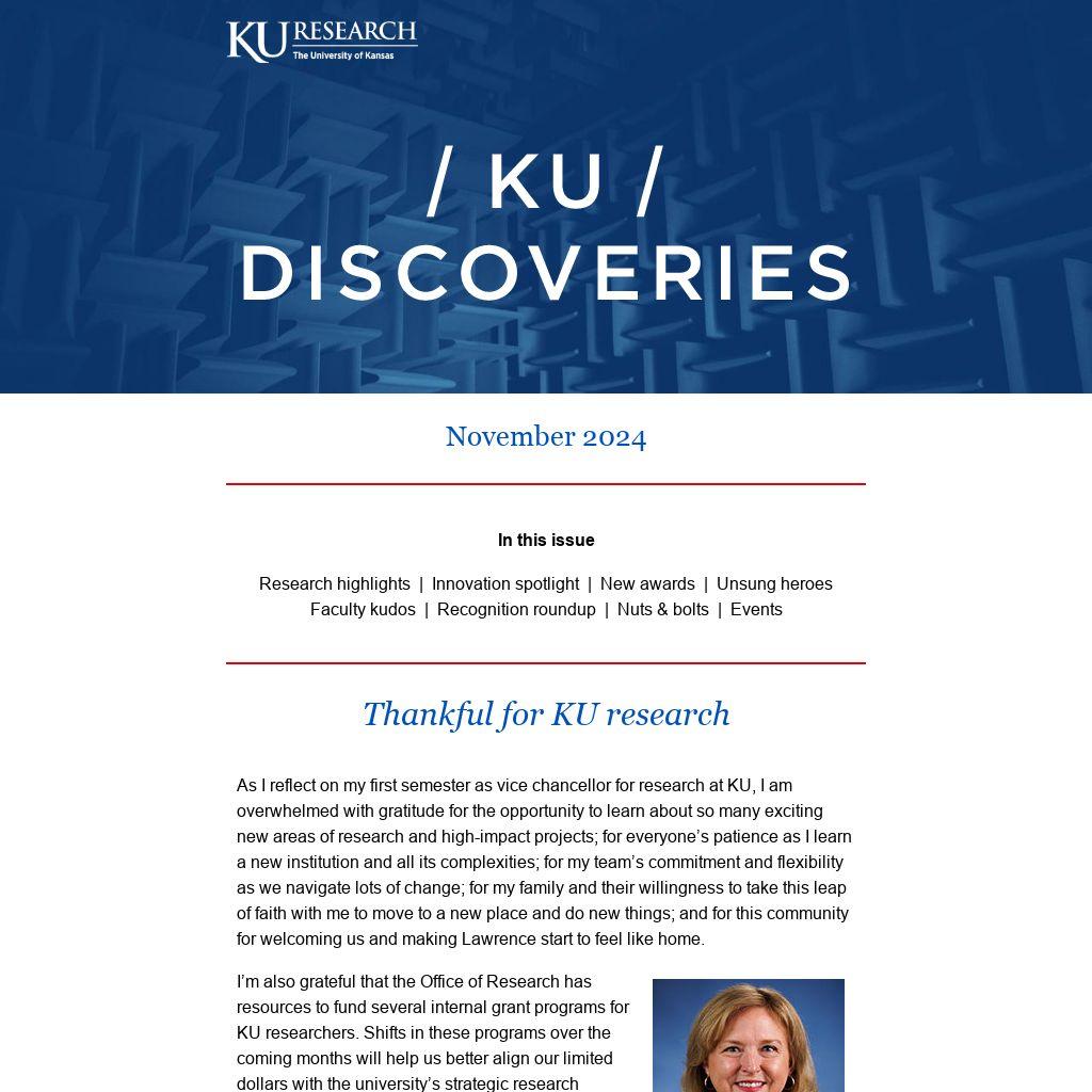 I’m also grateful that the Office of Research has resources to fund several internal grant programs for KU researchers. Shifts in these programs over the coming months will help us better align our limited dollars with the university’s strategic research priorities. We are re-envisioning KU Research GO as a seed program to support large, collaborative projects. We will share more details after the first of the year, but you can anticipate an April application deadline and an information/networking event for faculty to meet potential partners and learn about interdisciplinary project opportunities.