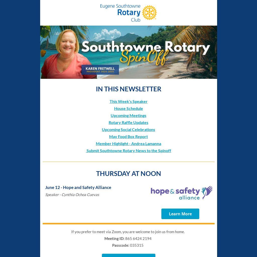 Have news to share in the Spinoff? Please have it submitted by Tuesday afternoon or it may not be in that week's edition. Email your news and pictures to: contact@southtownerotary.org.