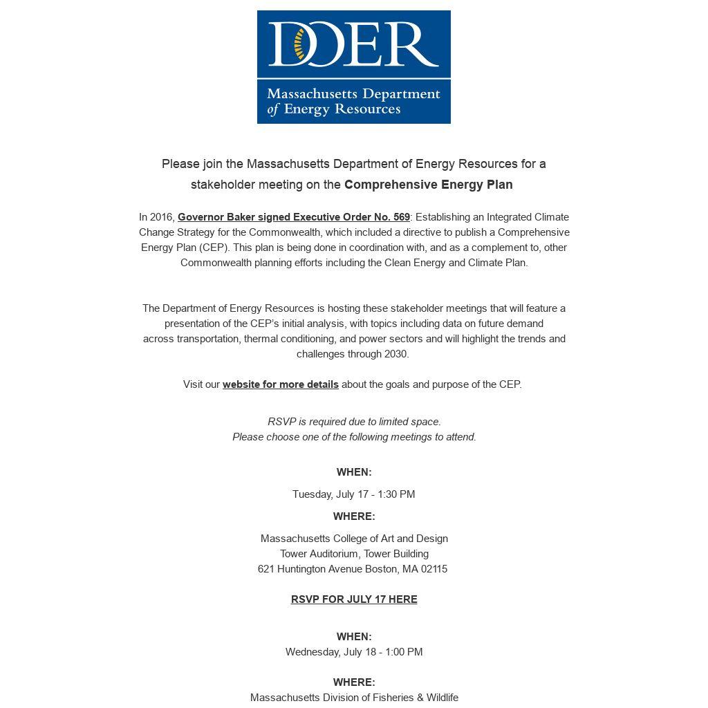 Please join the Massachusetts Department of Energy Resources for a stakeholder meeting on the Comprehensive Energy Plan