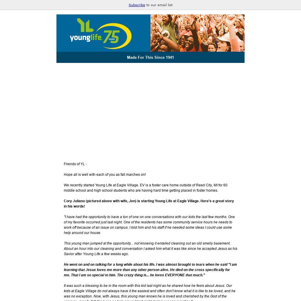 Cory Juliano (pictured above with wife, Jen) is starting Young Life at Eagle Village. Here's a great story in his words!