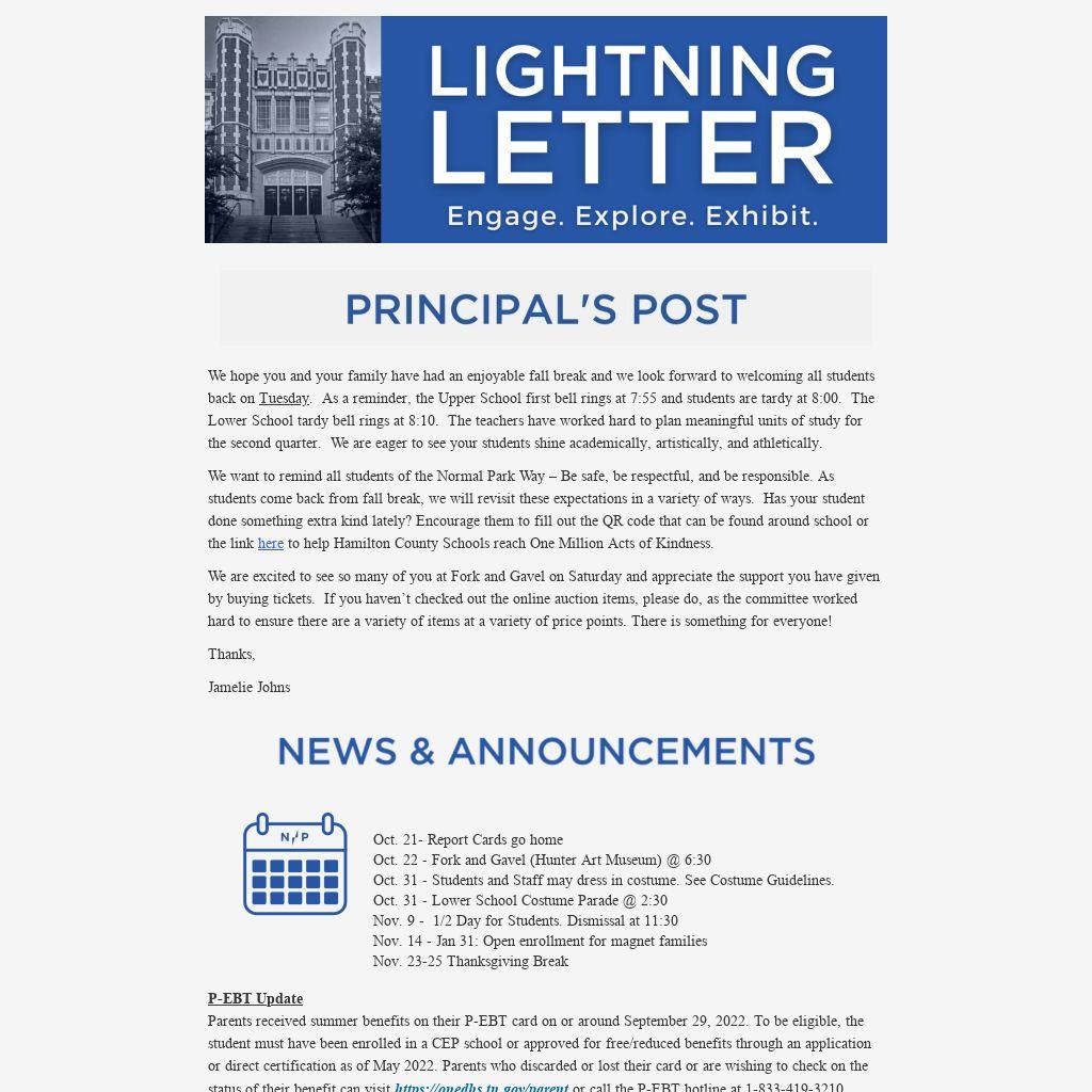 We hope you and your family have had an enjoyable fall break and we look forward to welcoming all students back on Tuesday. As a reminder, the Upper School first bell rings at 7:55 and students are tardy at 8:00. The Lower School tardy bell rings at 8:10. The teachers have worked hard to plan meaningful units of study for the second quarter. We are eager to see your students shine academically, artistically, and athletically.