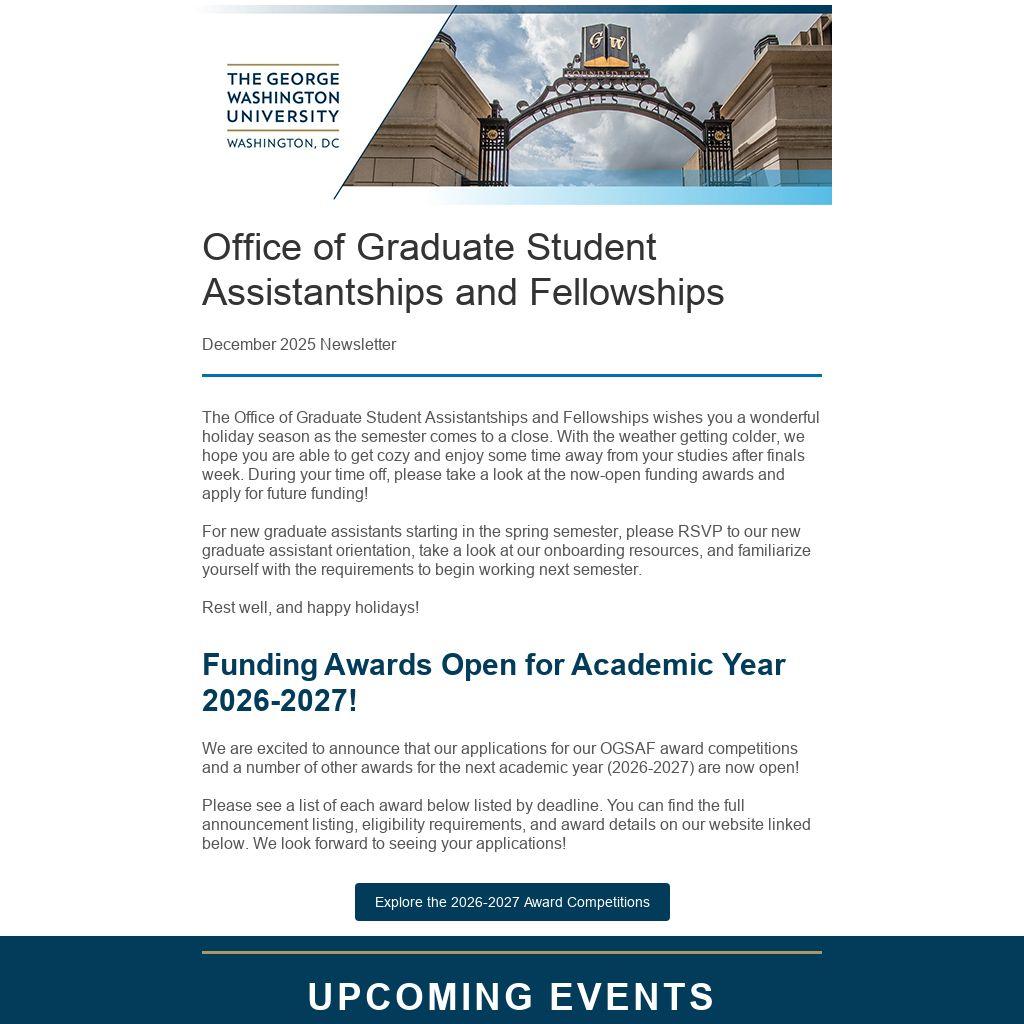 The Office of Graduate Student Assistantships and Fellowships wishes you a wonderful holiday season as the semester comes to a close. With the weather getting colder, we hope you are able to get cozy and enjoy some time away from your studies after finals week. During your time off, please take a look at the now-open funding awards and apply for future funding!