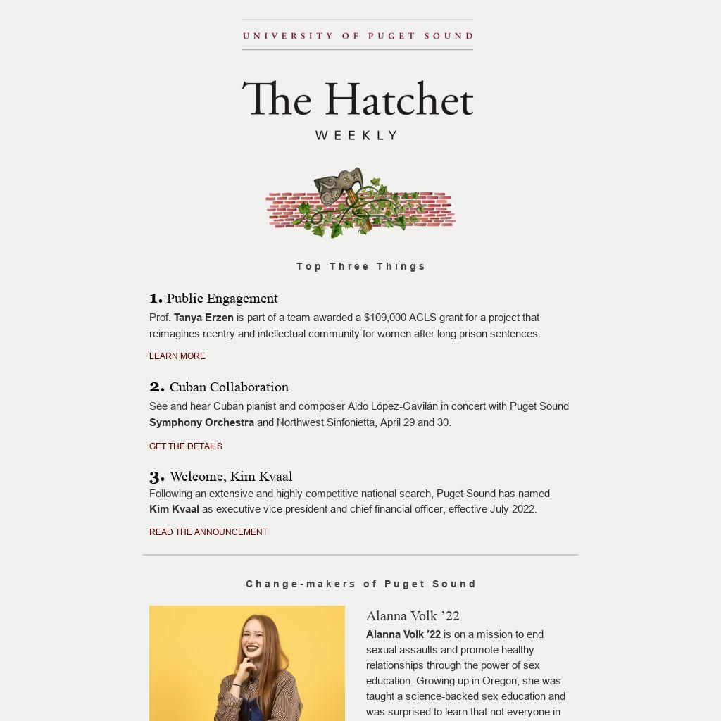 | THE PUGET SOUND AT PUGET SOUND In honor of Earth Day, a three-story-tall banner was hung on Jones Hall. The installation, titled Puget Sound, was the work of environmental artist Sukey Bryan P’20, who specializes in painting, printmaking, and public art. “Designed for Earth Day, this photograph of surface ripples on Puget Sound near Tacoma’s Dickman Park is a kind of visual pun on the university’s name,” wrote Bryan in an artist statement. “It celebrates the beauty of the waterway, the primacy of water in our environment, and our love and dedication to the protection of the Sound and its life forms.”