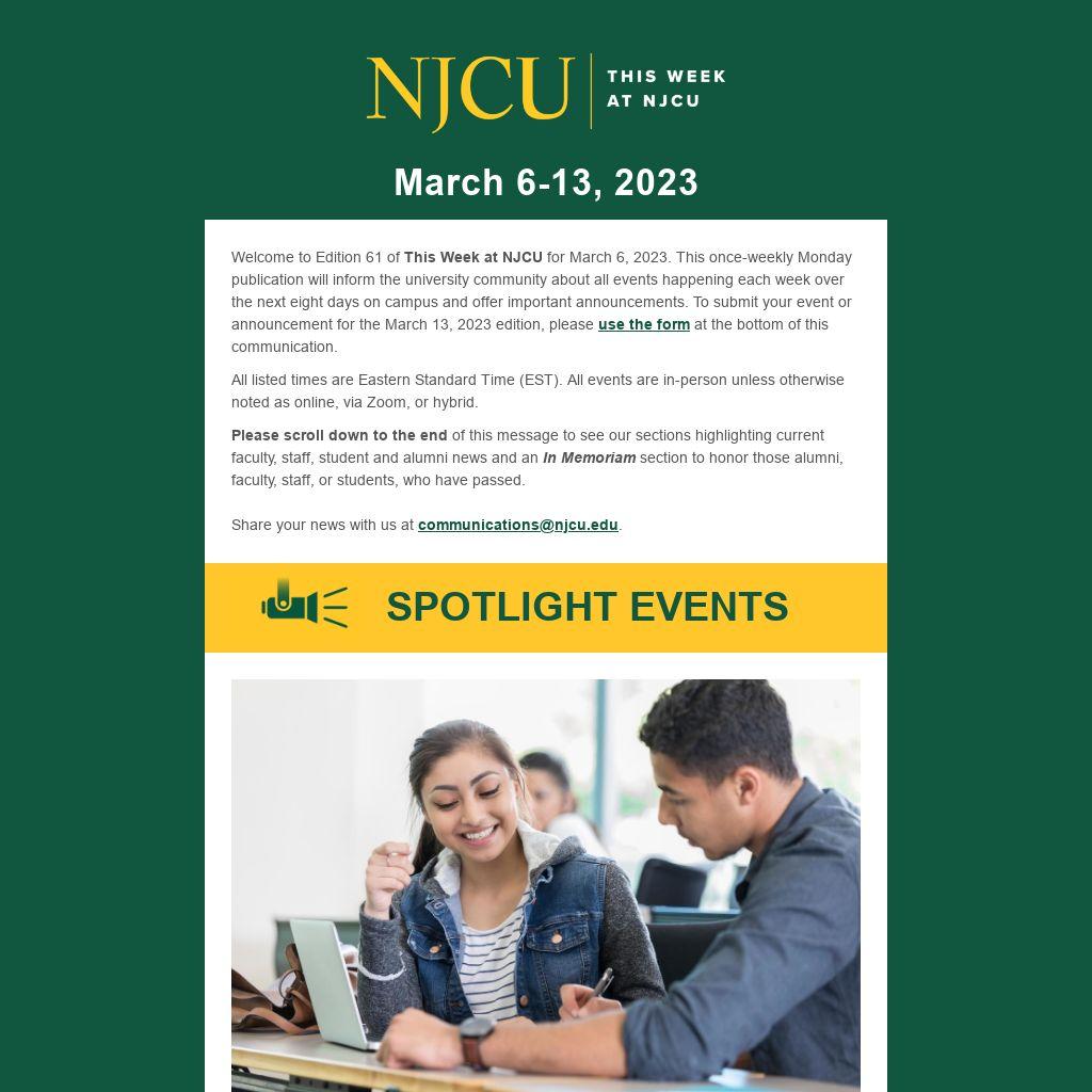 Welcome to Edition 61 of This Week at NJCU for March 6, 2023. This once-weekly Monday publication will inform the university community about all events happening each week over the next eight days on campus and offer important announcements. To submit your event or announcement for the March 13, 2023 edition, please use the form at the bottom of this communication.