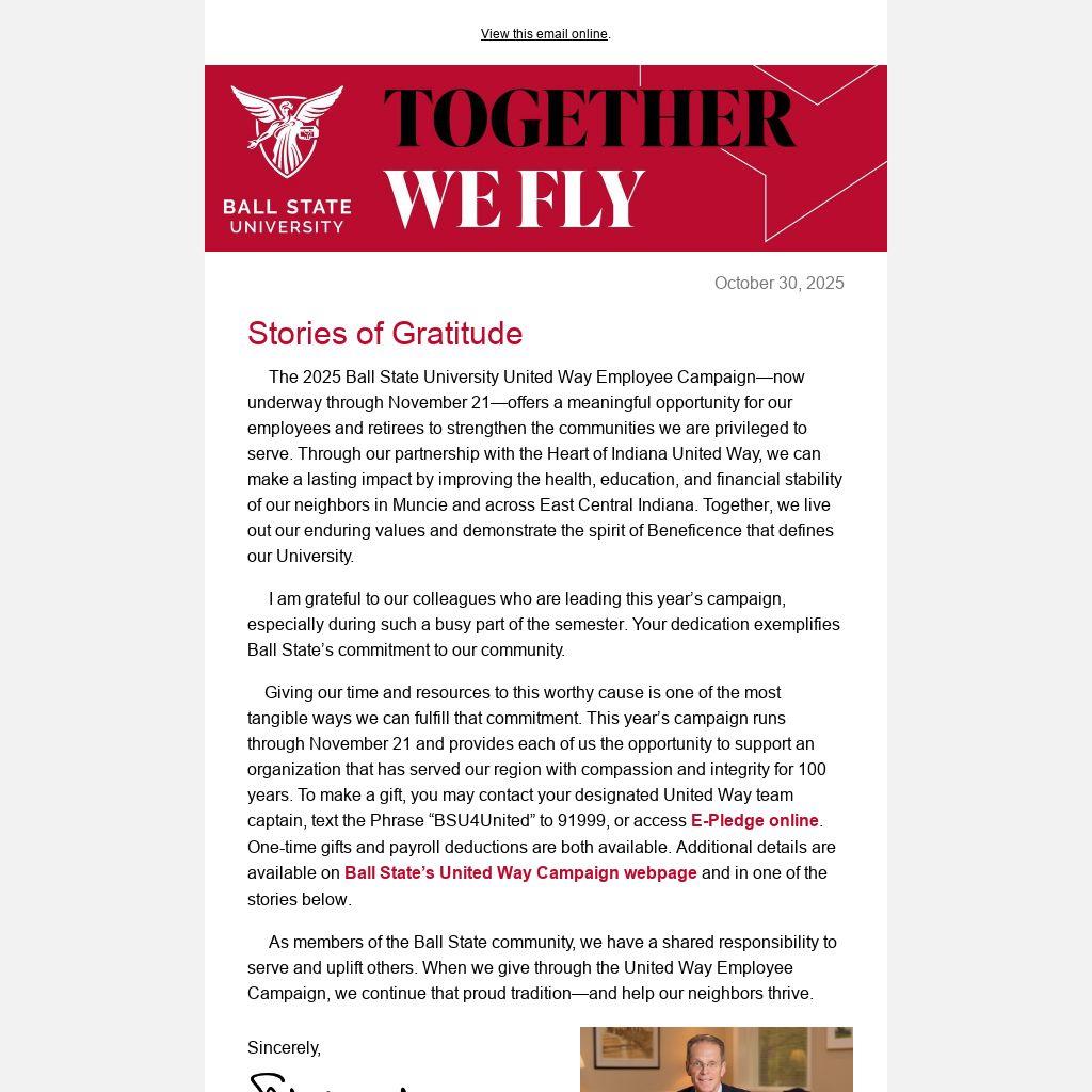 The 2025 Ball State University United Way Employee Campaign—now underway through November 21—offers a meaningful opportunity for our employees and retirees to strengthen the communities we are privileged to serve. Through our partnership with the Heart of Indiana United Way, we can make a lasting impact by improving the health, education, and financial stability of our neighbors in Muncie and across East Central Indiana. Together, we live out our enduring values and demonstrate the spirit of Beneficence that defines our University.