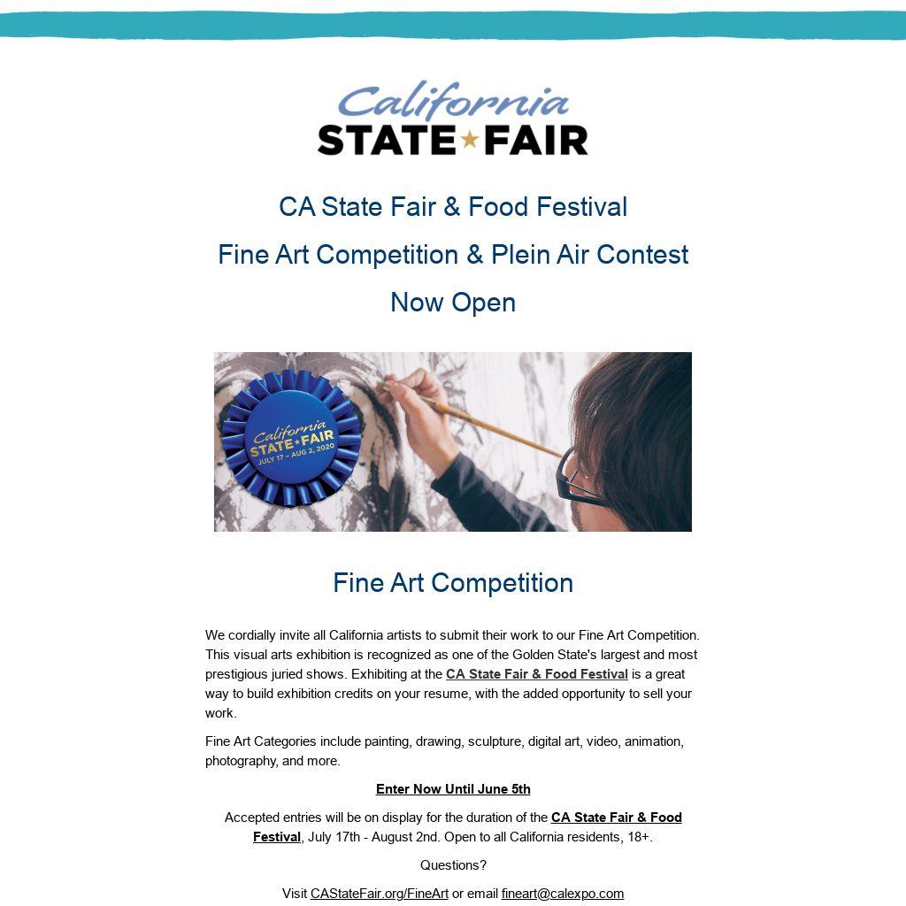 Accepted entries will be on display for the duration of the CA State Fair & Food Festival, July 17th - August 2nd. Open to all California residents, 18+.