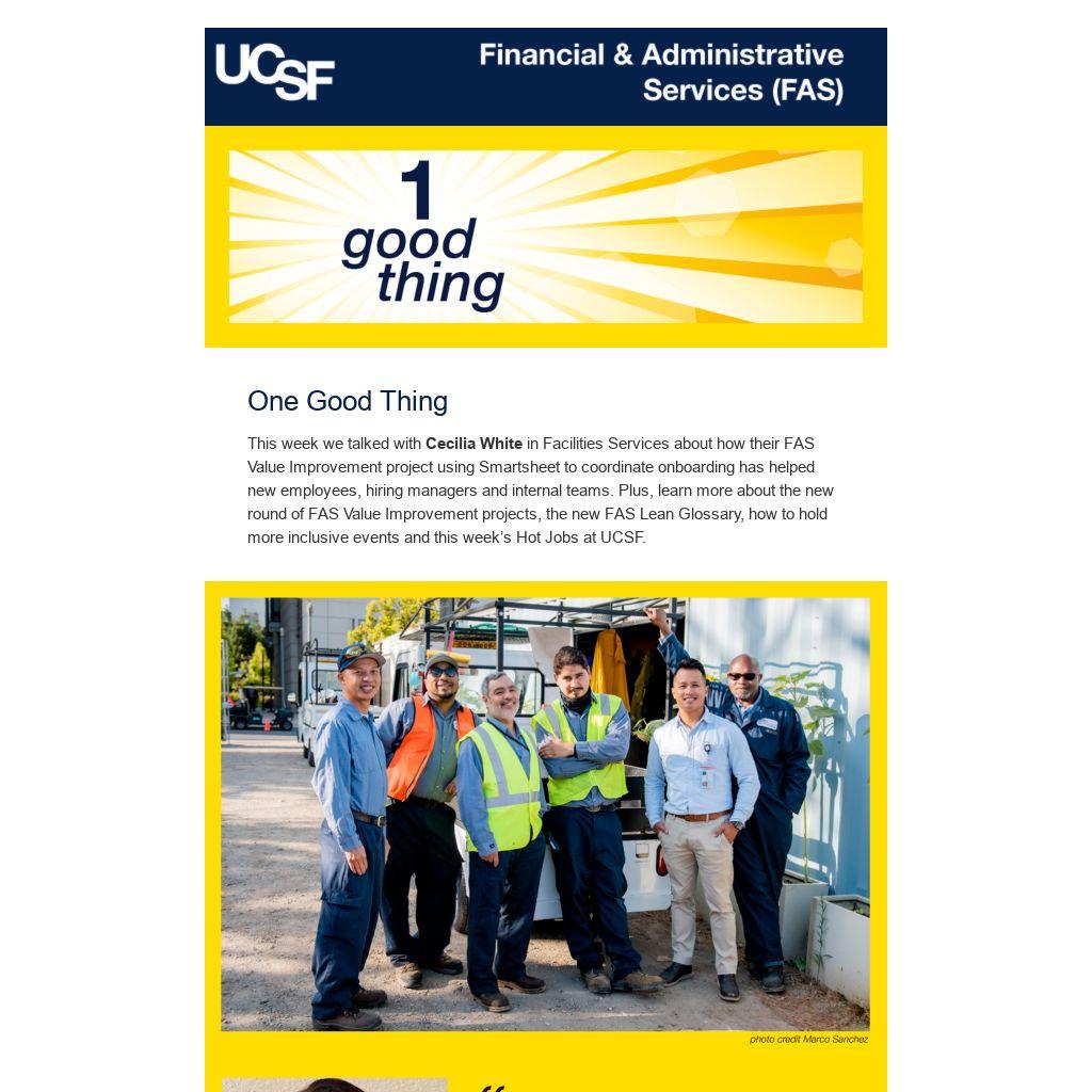 This week we talked with Cecilia White in Facilities Services about how their FAS Value Improvement project using Smartsheet to coordinate onboarding has helped new employees, hiring managers and internal teams. Plus, learn more about the new round of FAS Value Improvement projects, the new FAS Lean Glossary, how to hold more inclusive events and this week’s Hot Jobs at UCSF.