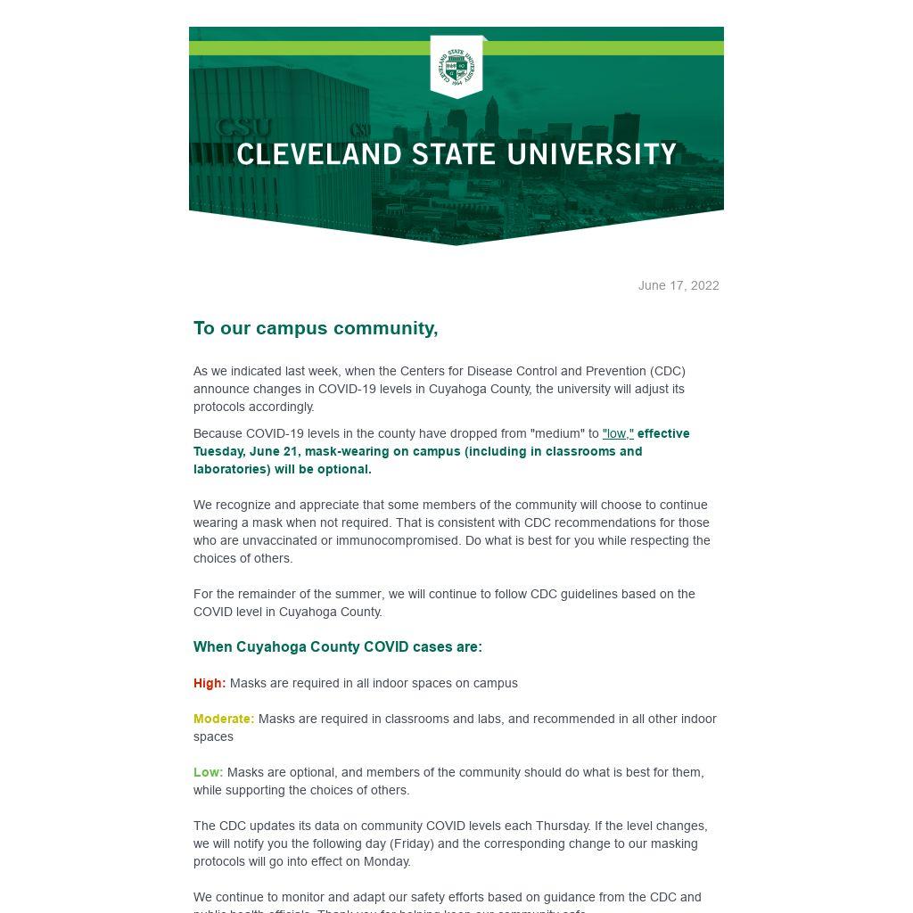 As we indicated last week, when the Centers for Disease Control and Prevention (CDC) announce changes in COVID-19 levels in Cuyahoga County, the university will adjust its protocols accordingly.