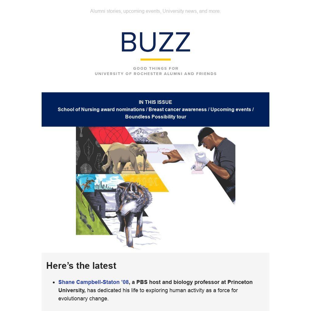 Rochester Buzz is produced by the University of Rochester Office of Alumni Relations. View issues online at rochester.edu/alumni/buzz. Direct feedback and questions to rochesterbuzz@rochester.edu.