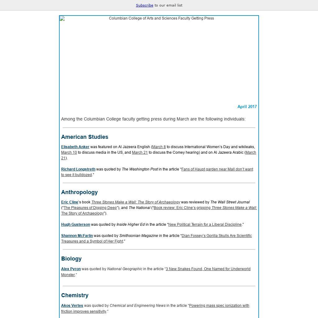 | | Among the Columbian College faculty getting press during March are the following individuals:
