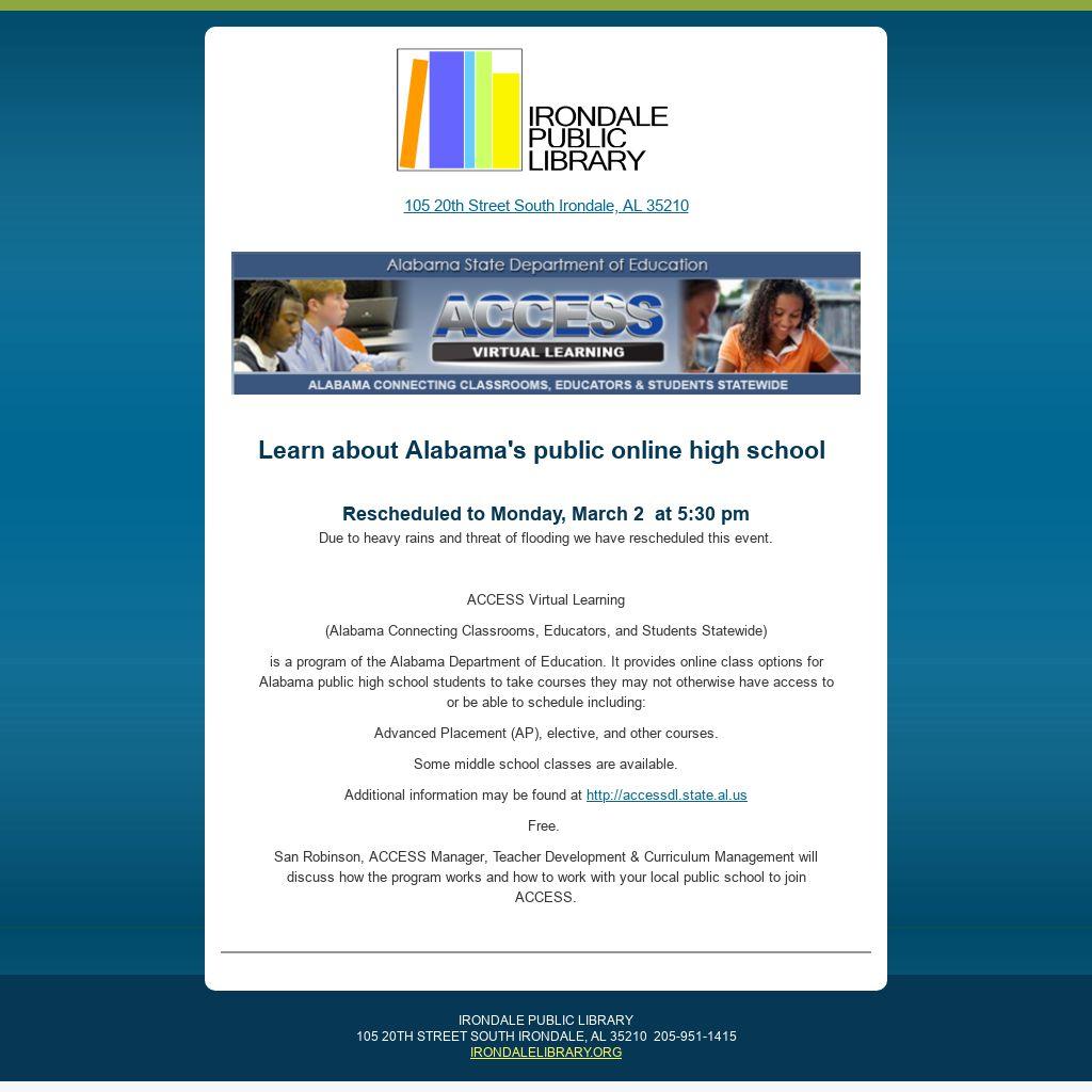 is a program of the Alabama Department of Education. It provides online class options for Alabama public high school students to take courses they may not otherwise have access to or be able to schedule including: