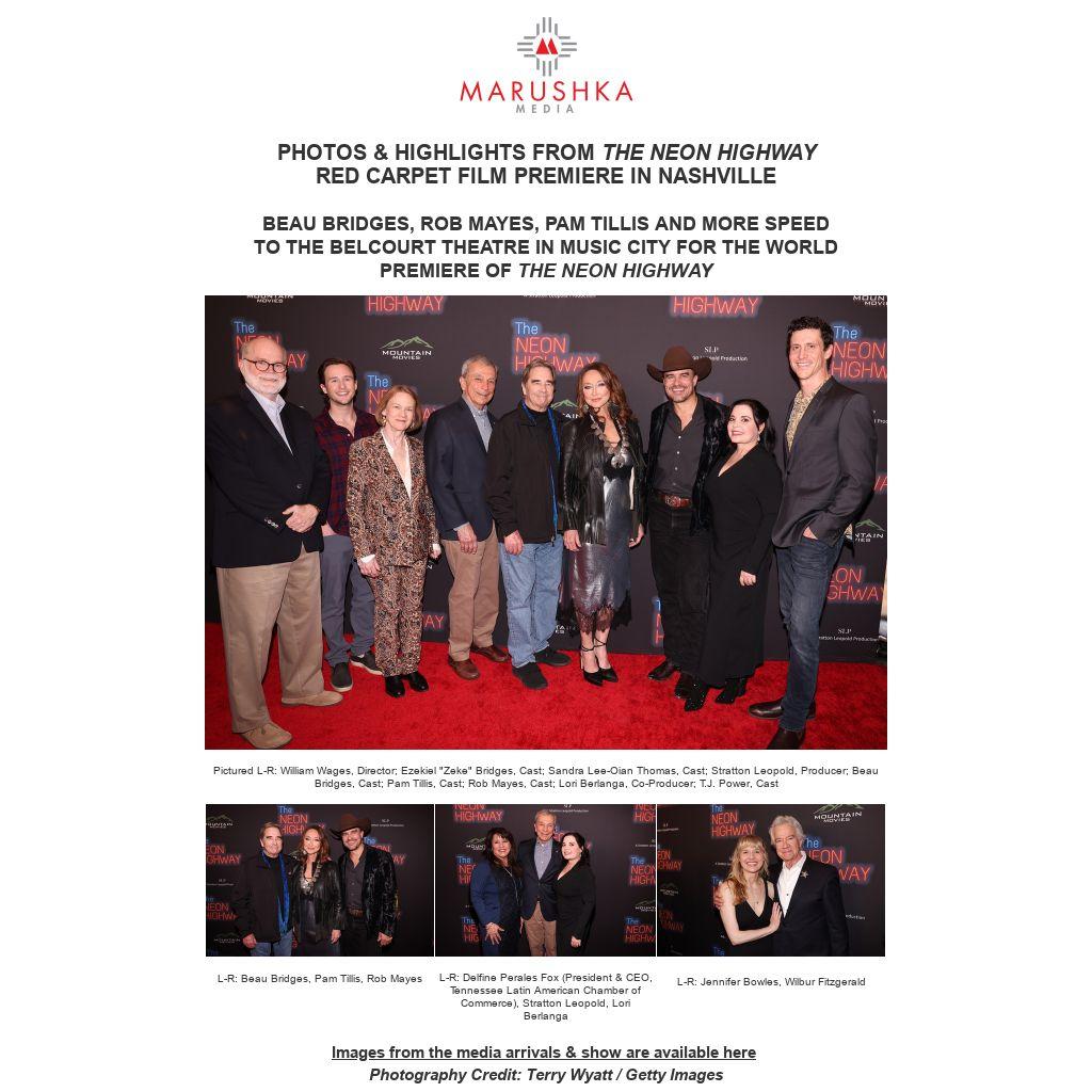 NASHVILLE, Tenn. (Mar. 13, 2024) — Earlier this evening, Hollywood gathered at Nashville’s iconic Belcourt Theatre for the world premiere of THE NEON HIGHWAY, opening in theaters on Friday, March 15th. The film’s leading cast: Emmy, GRAMMY, and Golden Globe Award-winner Beau Bridges, Rob Mayes, Sandra Lee-Oian Thomas, Pam Tillis, and T.J. Power along with the film’s director William Wages, producer Stratton Leopold and co-producer Lori Berlanga walked the red carpet welcoming fans and supporters of the film.