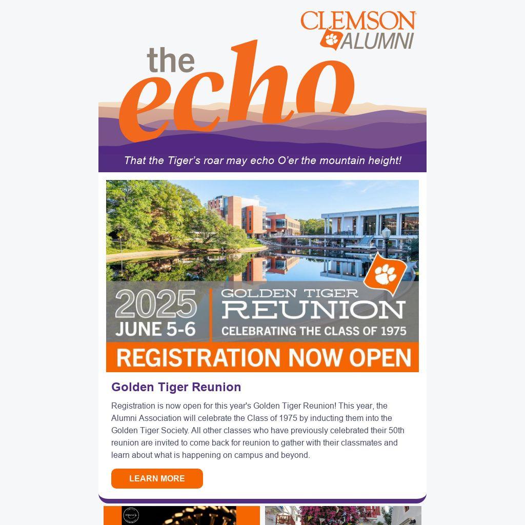 Registration is now open for this year's Golden Tiger Reunion! This year, the Alumni Association will celebrate the Class of 1975 by inducting them into the Golden Tiger Society. All other classes who have previously celebrated their 50th reunion are invited to come back for reunion to gather with their classmates and learn about what is happening on campus and beyond.