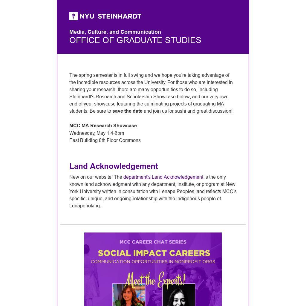 The spring semester is in full swing and we hope you're taking advantage of the incredible resources across the University. For those who are interested in sharing your research, there are many opportunities to do so, including Steinhardt's Research and Scholarship Showcase below, and our very own end of year showcase featuring the culminating projects of graduating MA students. Be sure to save the date and join us for sushi and great discussion!