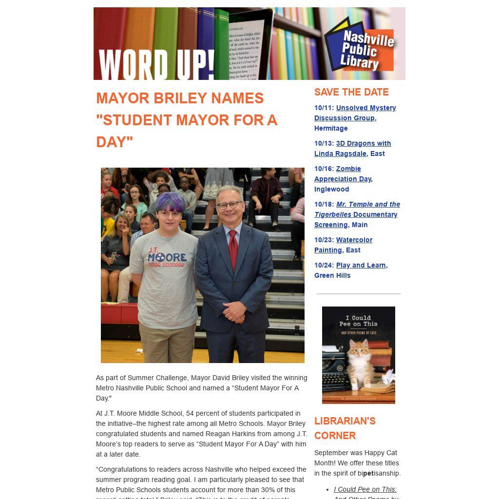 At J.T. Moore Middle School, 54 percent of students participated in the initiative–the highest rate among all Metro Schools. Mayor Briley congratulated students and named Reagan Harkins from among J.T. Moore’s top readers to serve as “Student Mayor For A Day” with him at a later date.