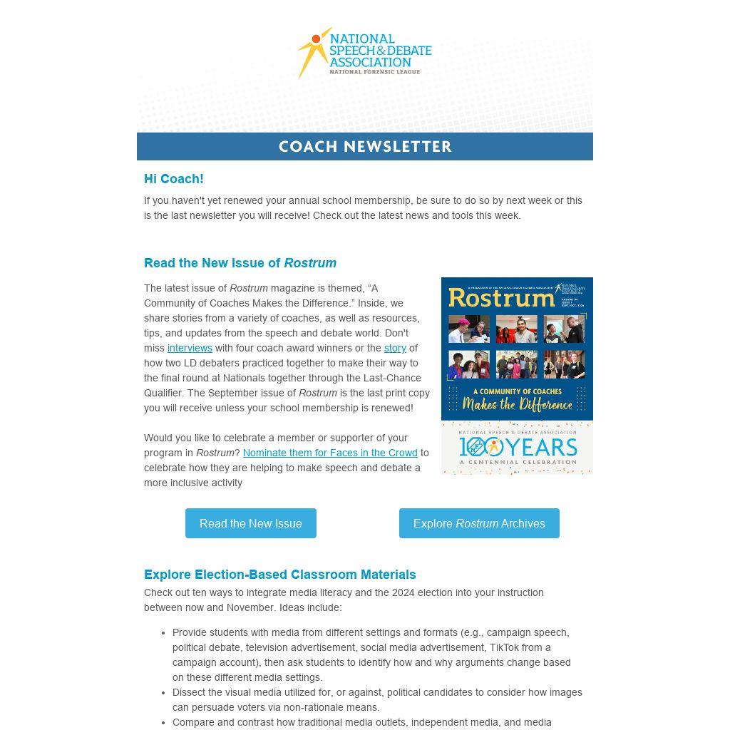 The latest issue of Rostrum magazine is themed, “A Community of Coaches Makes the Difference.” Inside, we share stories from a variety of coaches, as well as resources, tips, and updates from the speech and debate world. Don't miss interviews with four coach award winners or the story of how two LD debaters practiced together to make their way to the final round at Nationals together through the Last-Chance Qualifier. The September issue of Rostrum is the last print copy you will receive unless your school membership is renewed!