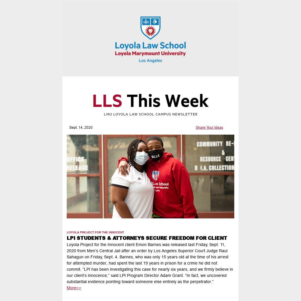 Loyola Project for the Innocent client Emon Barnes was released last Friday, Sept. 11, 2020 from Men’s Central Jail after an order by Los Angeles Superior Court Judge Raul Sahagun on Friday, Sept. 4. Barnes, who was only 15 years old at the time of his arrest for attempted murder, had spent the last 19 years in prison for a crime he did not commit. “LPI has been investigating this case for nearly six years, and we firmly believe in our client’s innocence,” said LPI Program Director Adam Grant. “In fact, we uncovered substantial evidence pointing toward someone else entirely as the perpetrator.” More>>