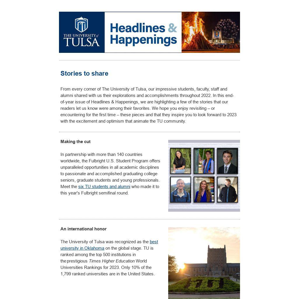 From every corner of The University of Tulsa, our impressive students, faculty, staff and alumni shared with us their explorations and accomplishments throughout 2022. In this end-of-year issue of Headlines & Happenings, we are highlighting a few of the stories that our readers let us know were among their favorites. We hope you enjoy revisiting – or encountering for the first time – these pieces and that they inspire you to look forward to 2023 with the excitement and optimism that animate the TU community.