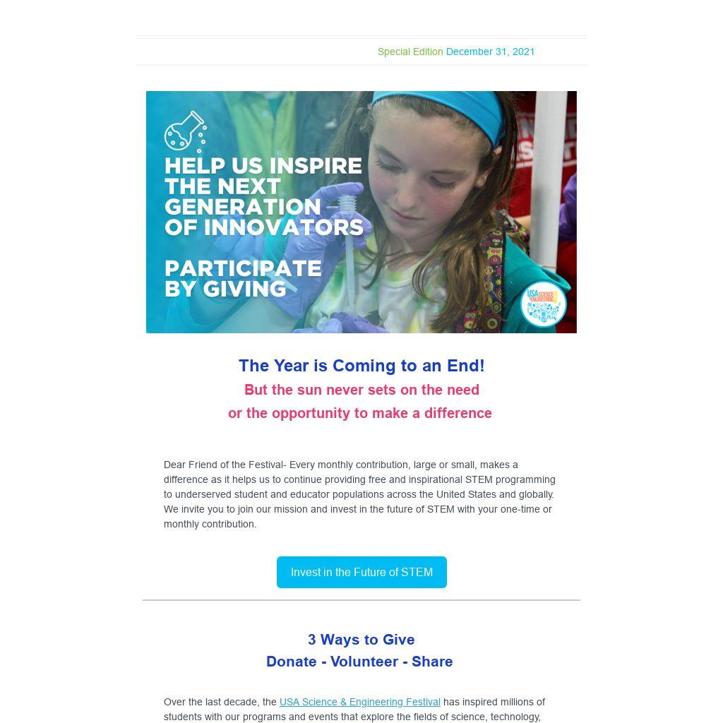 Dear Friend of the Festival- Every monthly contribution, large or small, makes a difference as it helps us to continue providing free and inspirational STEM programming to underserved student and educator populations across the United States and globally. We invite you to join our mission and invest in the future of STEM with your one-time or monthly contribution.