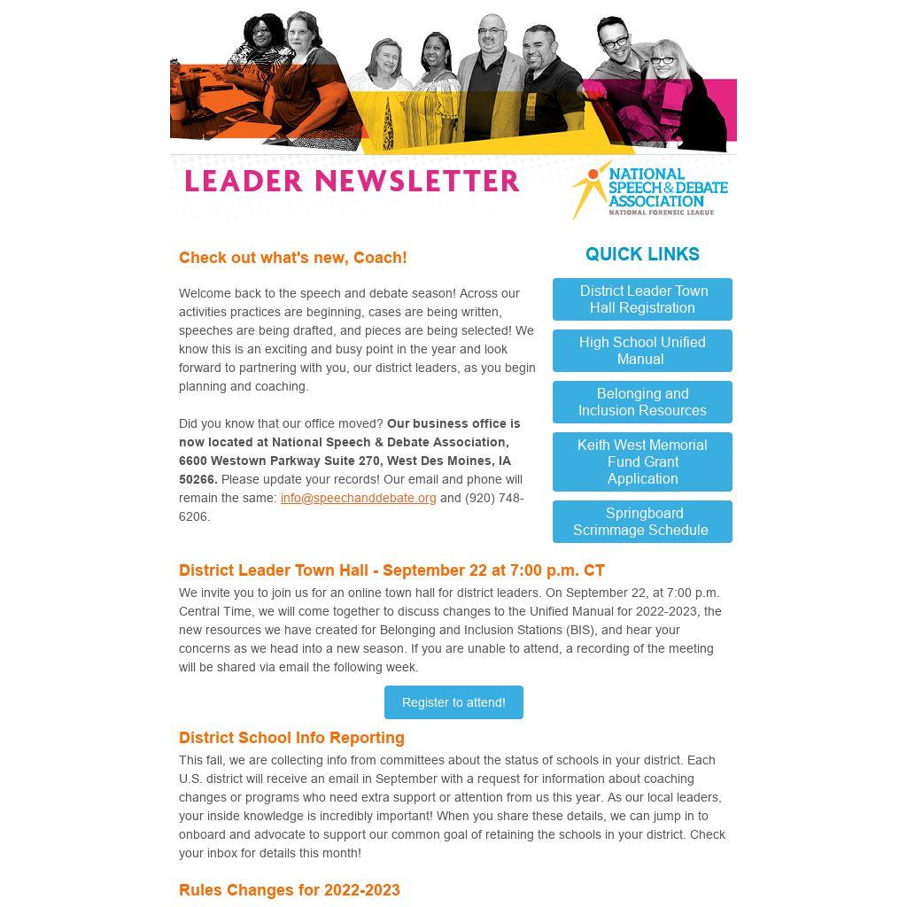 Welcome back to the speech and debate season! Across our activities practices are beginning, cases are being written, speeches are being drafted, and pieces are being selected! We know this is an exciting and busy point in the year and look forward to partnering with you, our district leaders, as you begin planning and coaching.