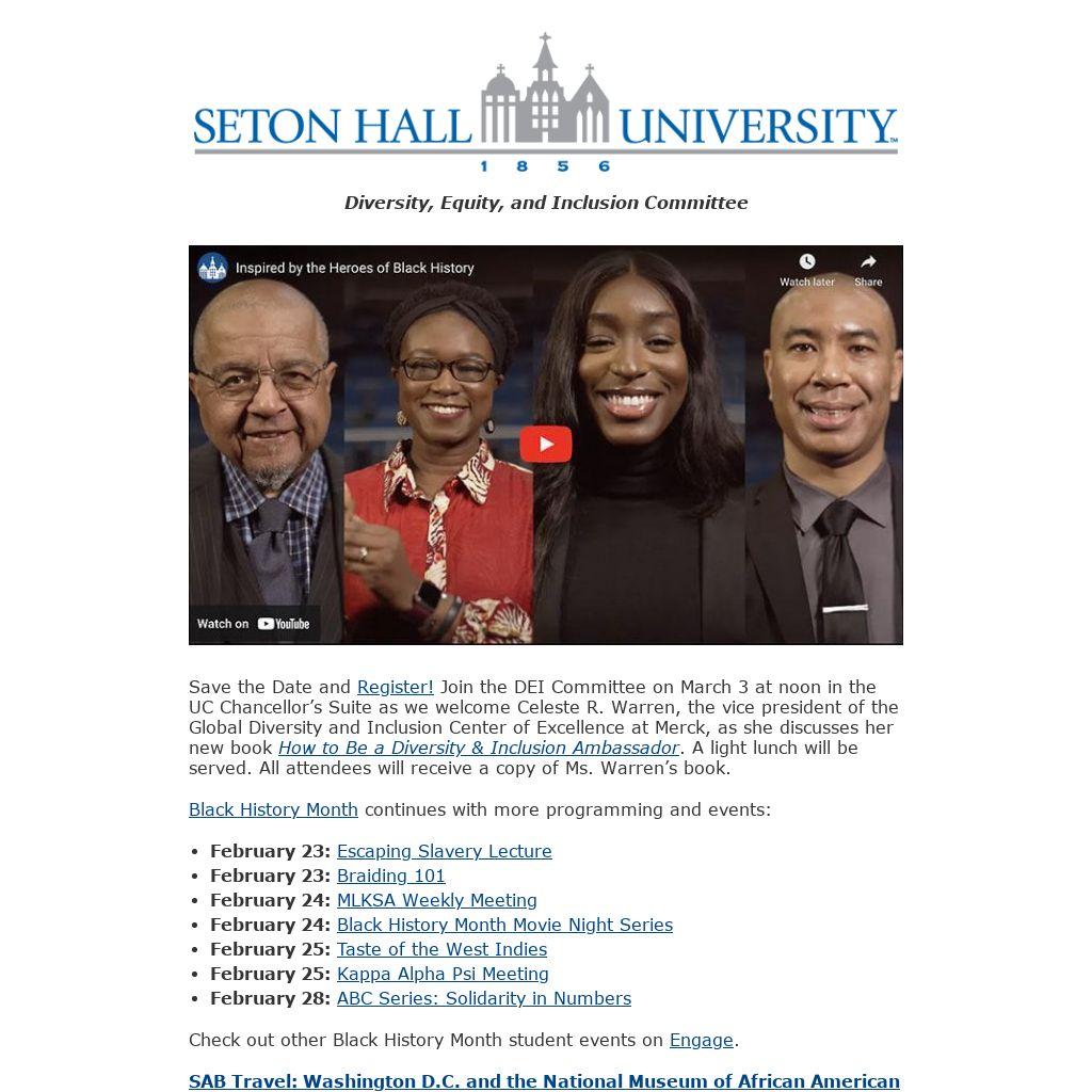 We welcome your ideas for programming, initiatives, and more! Please write us at dei@shu.edu. The DEI Committee is responsible for helping to cultivate and nurture a trusting and collaborative University community that educates and empowers all its members to advance equity, inclusion, and social justice on campus and in the wider world. Please fill out this form if you are interested in getting involved.