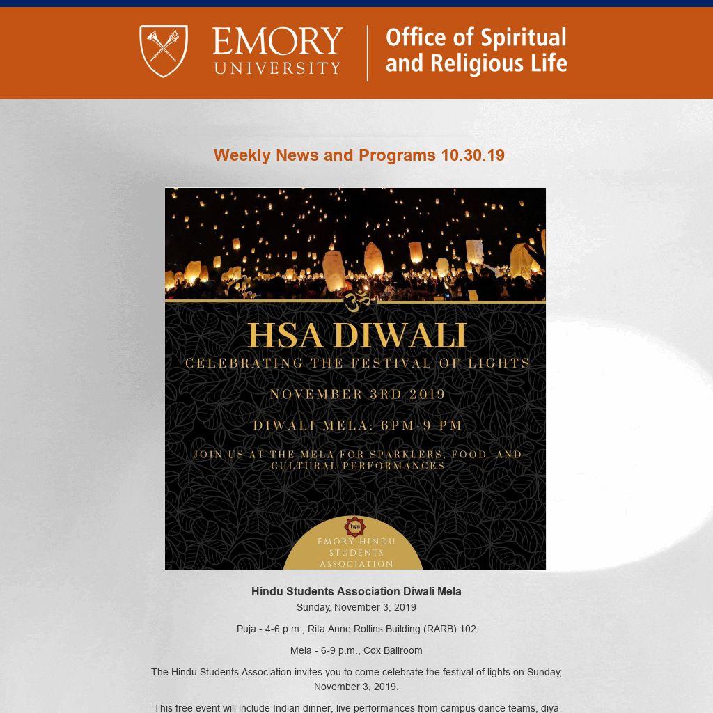 Emory OSRL Enews is published weekly during term by the Emory University Office of Spiritual and Religious Life covering Atlanta-campus programs. For Oxford College spiritual life, please click here. To submit information or to update your preferences, please contact religiouslife@emory.edu.