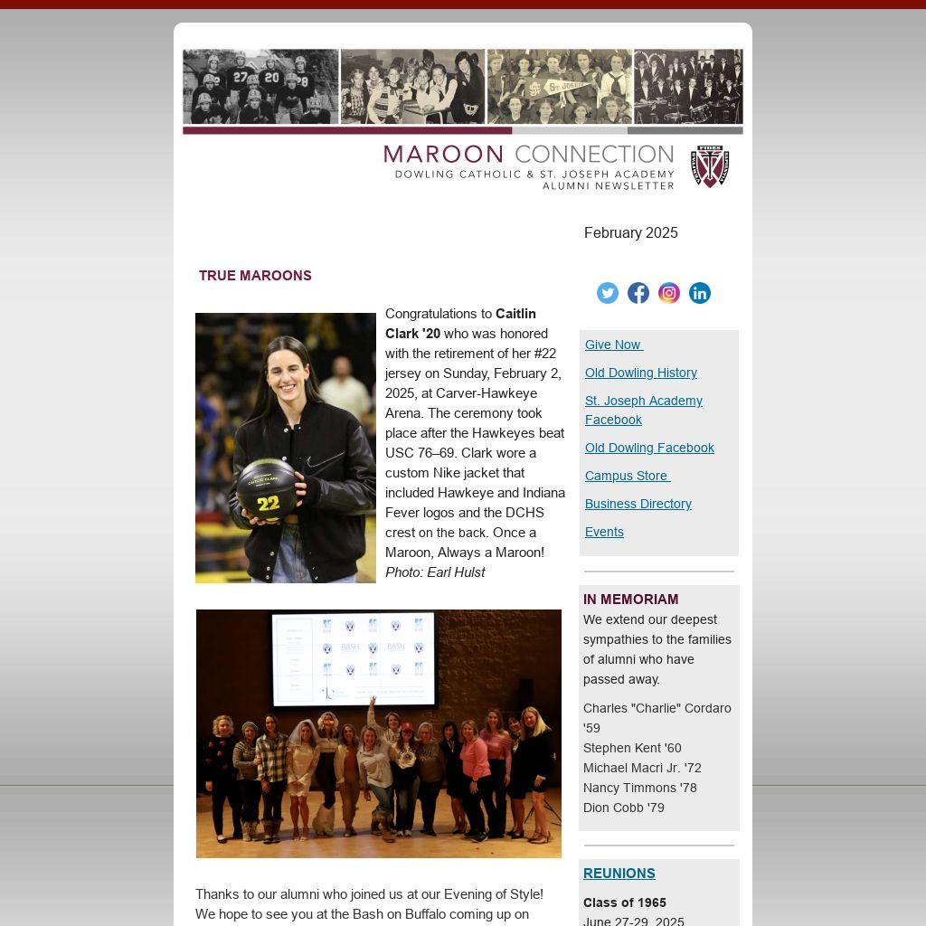 Congratulations to Caitlin Clark '20 who was honored with the retirement of her #22 jersey on Sunday, February 2, 2025, at Carver-Hawkeye Arena. The ceremony took place after the Hawkeyes beat USC 76–69. Clark wore a custom Nike jacket that included Hawkeye and Indiana Fever logos and the DCHS crest on the back. Once a Maroon, Always a Maroon! Photo: Earl Hulst