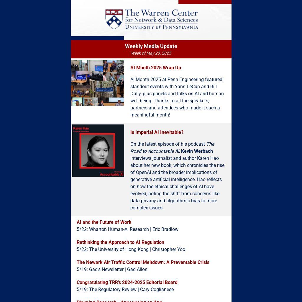 On the latest episode of his podcast The Road to Accountable AI, Kevin Werbach interviews journalist and author Karen Hao about her new book, which chronicles the rise of OpenAI and the broader implications of generative artificial intelligence. Hao reflects on how the ethical challenges of AI have evolved, noting the shift from concerns like data privacy and algorithmic bias to more complex issues.