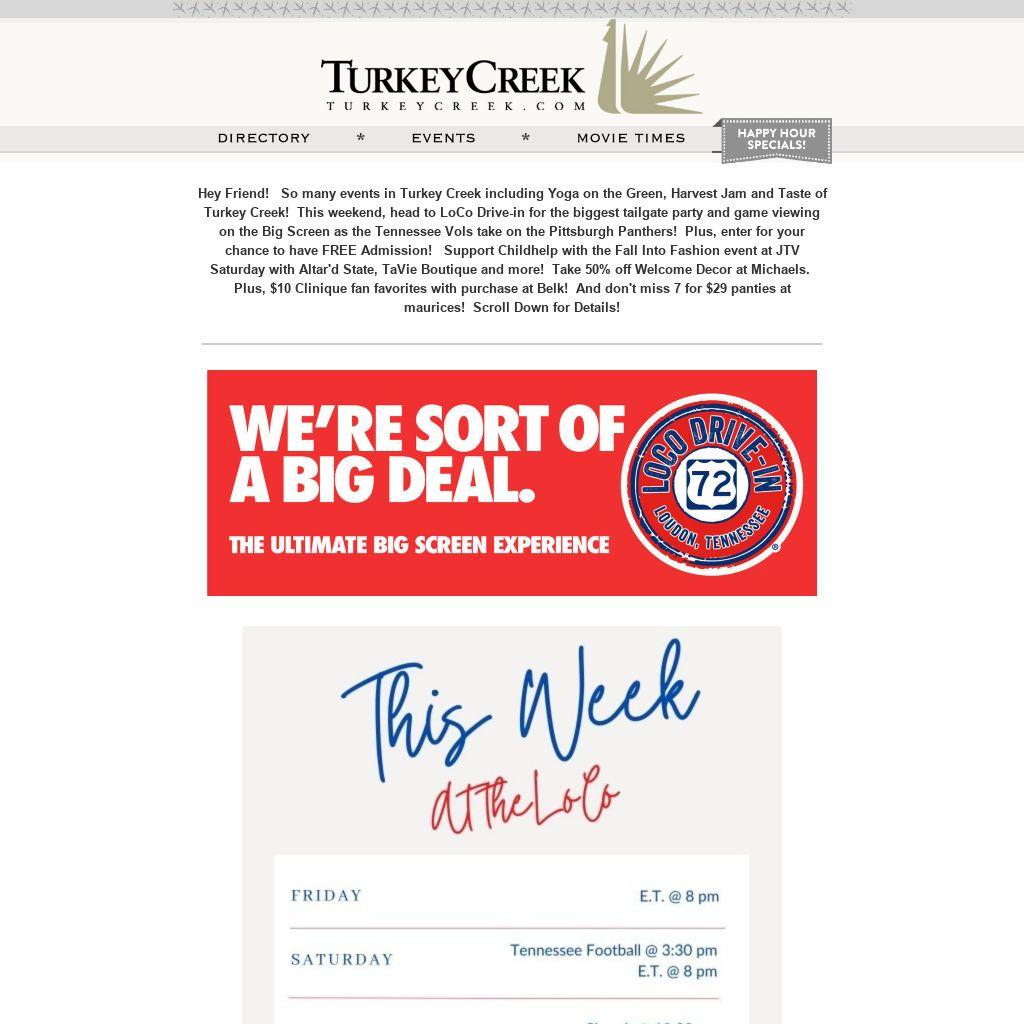 Hey Friend! So many events in Turkey Creek including Yoga on the Green, Harvest Jam and Taste of Turkey Creek! This weekend, head to LoCo Drive-in for the biggest tailgate party and game viewing on the Big Screen as the Tennessee Vols take on the Pittsburgh Panthers! Plus, enter for your chance to have FREE Admission! Support Childhelp with the Fall Into Fashion event at JTV Saturday with Altar'd State, TaVie Boutique and more! Take 50% off Welcome Decor at Michaels. Plus, $10 Clinique fan favorites with purchase at Belk! And don't miss 7 for $29 panties at maurices! Scroll Down for Details!