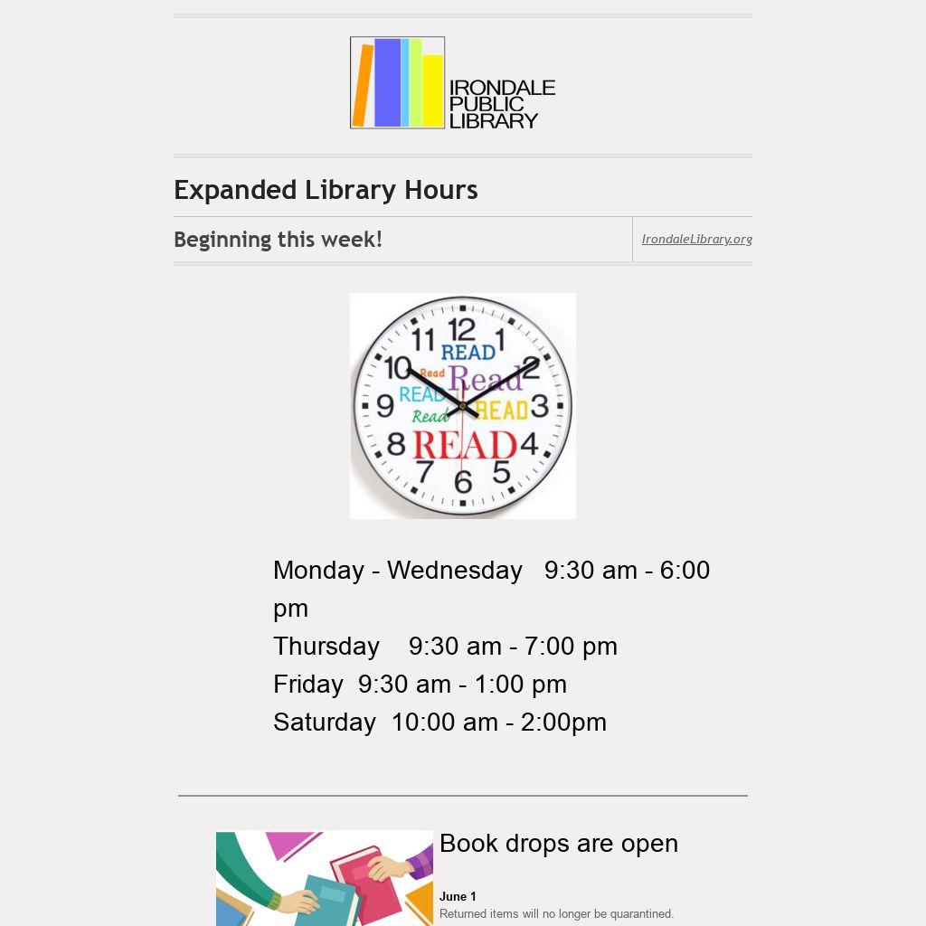 Late fees will be applied to overdue items that belong to Irondale Public Library. Items that belong to other libraries will be handled according to that library's policies.
