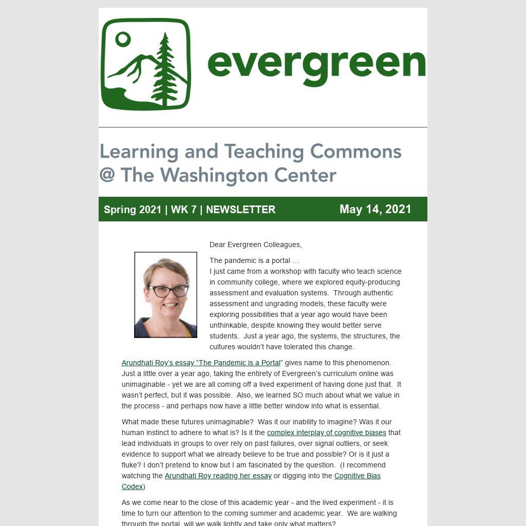 - An email update on the New Directions for Evergreen Initiative was shared. For more information on the Paths Project, certificates, graduate and professional studies, capstones, holistic advising, and more, review this email.