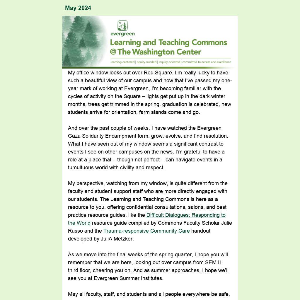 As we move into the final weeks of the spring quarter, I hope you will remember that we are here, looking out over campus from SEM II third floor, cheering you on. And as summer approaches, I hope we’ll see you at Evergreen Summer Institutes.