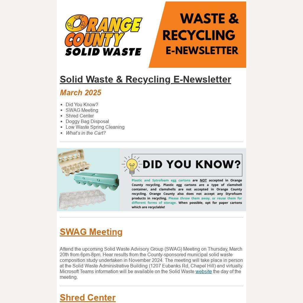 Attend the upcoming Solid Waste Advisory Group (SWAG) Meeting on Thursday, March 20th from 6pm-8pm. Hear results from the County-sponsored municipal solid waste composition study undertaken in November 2024. The meeting will take place in person at the Solid Waste Administrative Building (1207 Eubanks Rd, Chapel Hill) and virtually. Microsoft Teams information will be available on the Solid Waste website the day of the meeting.