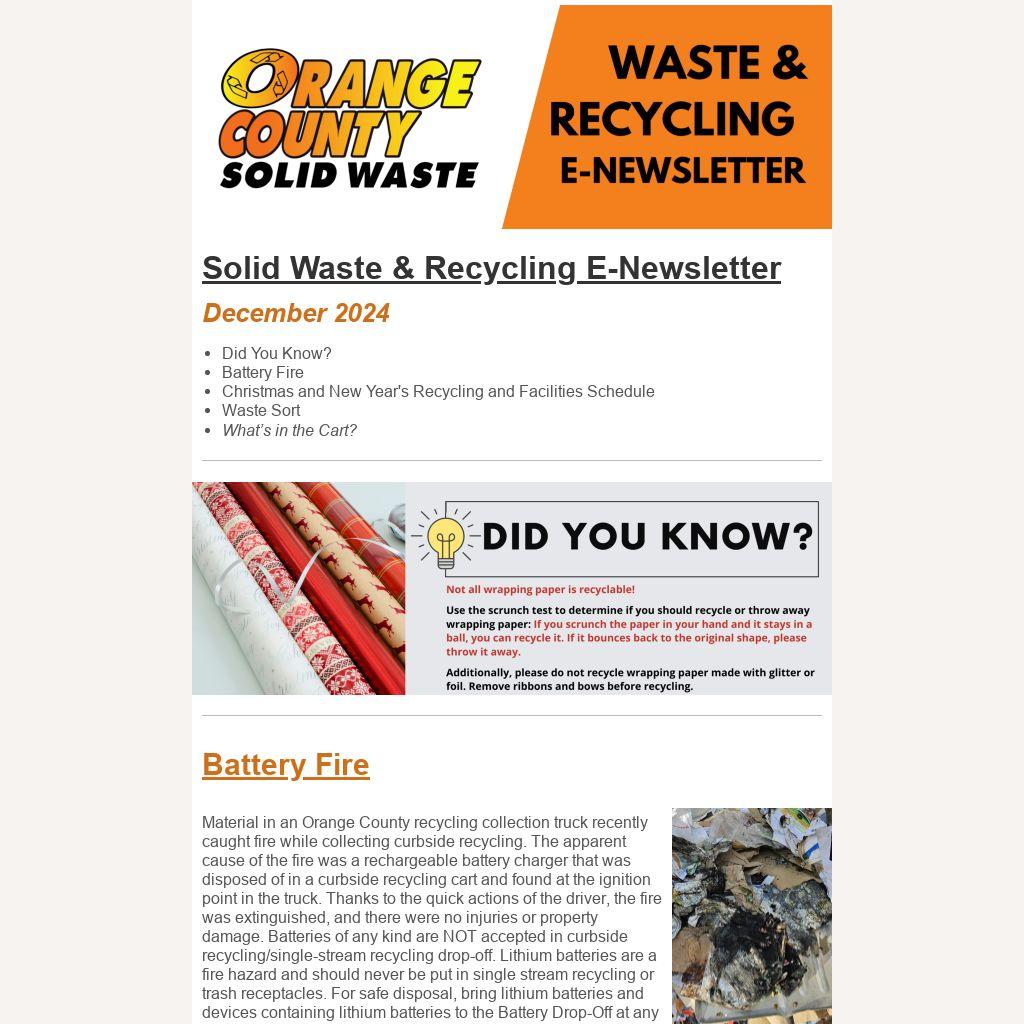 Material in an Orange County recycling collection truck recently caught fire while collecting curbside recycling. The apparent cause of the fire was a rechargeable battery charger that was disposed of in a curbside recycling cart and found at the ignition point in the truck. Thanks to the quick actions of the driver, the fire was extinguished, and there were no injuries or property damage. Batteries of any kind are NOT accepted in curbside recycling/single-stream recycling drop-off. Lithium batteries are a fire hazard and should never be put in single stream recycling or trash receptacles. For safe disposal, bring lithium batteries and devices containing lithium batteries to the Battery Drop-Off at any of the five county Waste & Recycling Centers.