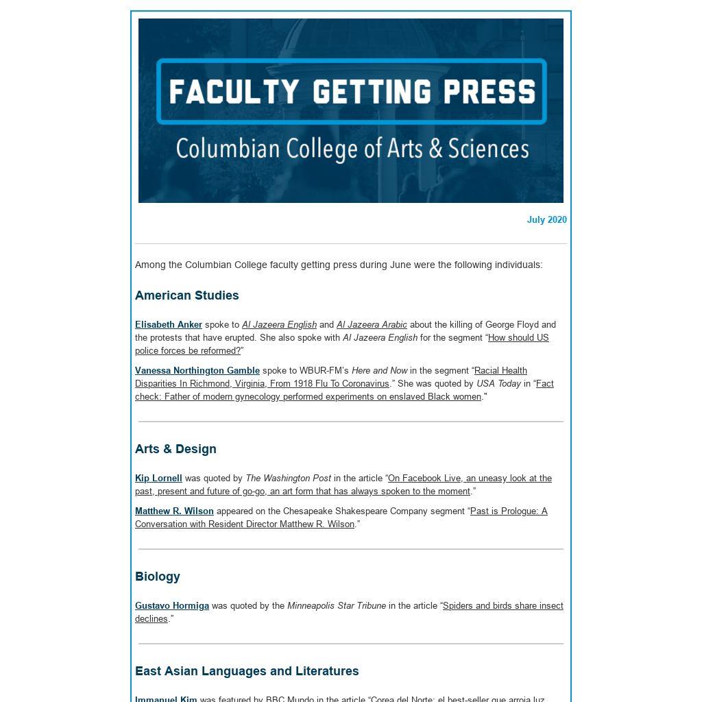 | | Among the Columbian College faculty getting press during June were the following individuals: