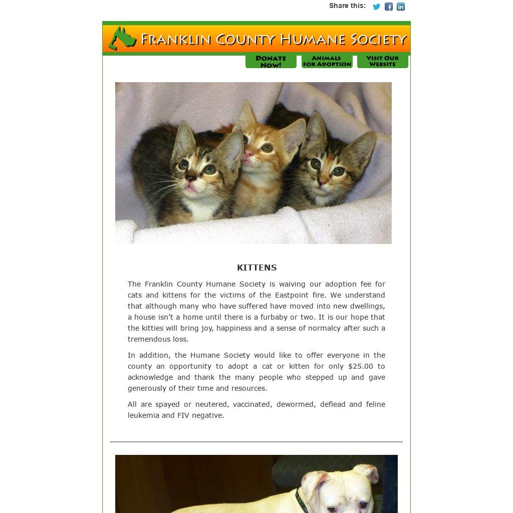 The Franklin County Humane Society is the only rescue/shelter in the county and we are the only ticket out for the many hundreds of dogs and cats that come through our door each year. There is no way this community can absorb all of them via adoption and that's where transfer comes in.